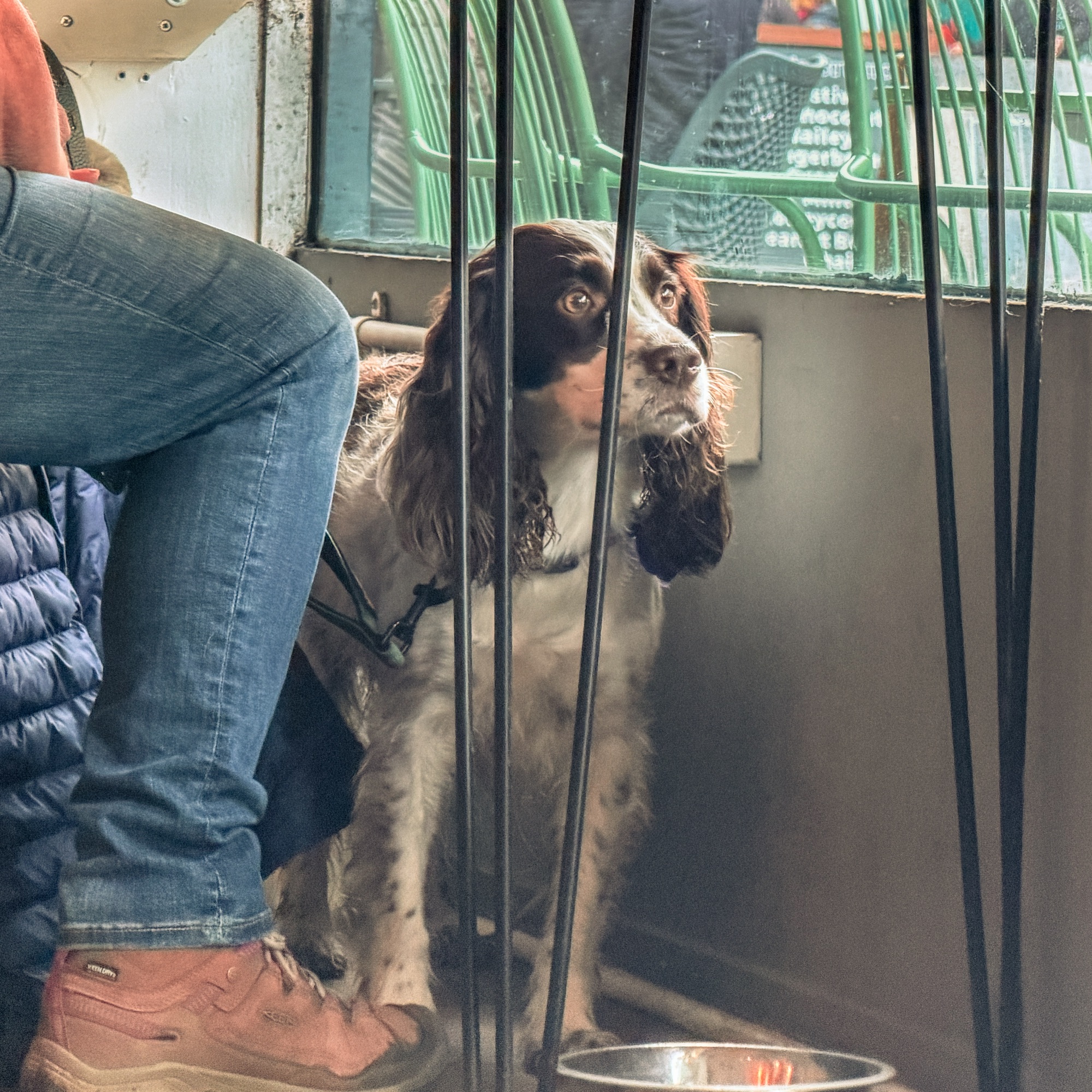 There’s always one face in a café that tells the real story — and today it was this one. Sitting quietly under the table, half-hidden behind chair legs and a tangle of leads, watching the world with patient, slightly worried eyes.